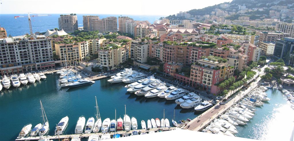 View down from the palace area to one harbour at Monaco, check out the gardens on top of all the buildings: