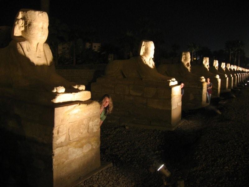 There is a road leading to the temple, which is lined with Sphinx's (you can just make out Fiona, Teena and Mel here, 3 of the many cool chicks on our tour):
