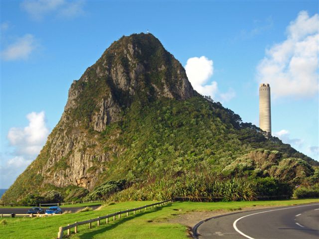 Scott lives in New Plymouth and so does a good mate of mine, Simon, who took me out for a stroll around the old hood so I could check out Paritutu Rock from above Back Beach (with the famous wharf chimney behind it):